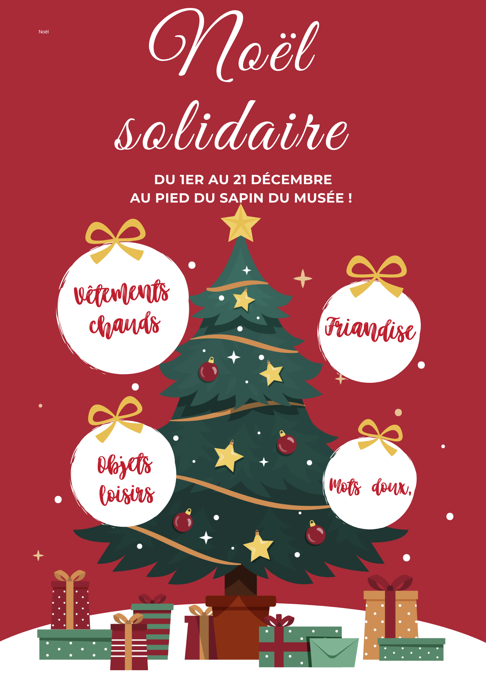 Du 1er au 20 décembre ! Une nouvelle fois le Musée du Gévaudan participe au Noël Solidaire ! Amenez vos cadeaux au pied du sapin du Musée, ils seront ensuite distribués à deux associations : Les Restos du Coeur de Lozère et Secours Catholique Lozère pour que tout le monde puisse vivre une belle fin d'année !